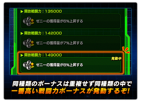 特定の戦闘力に到達することで開放されるボーナス効果になります。