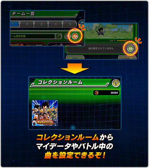 チーム一覧やマイデータ内に獲得した曲の再生や