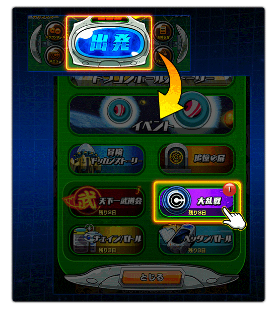 「大乱戦」ボタンに「!」マークが表示されます。